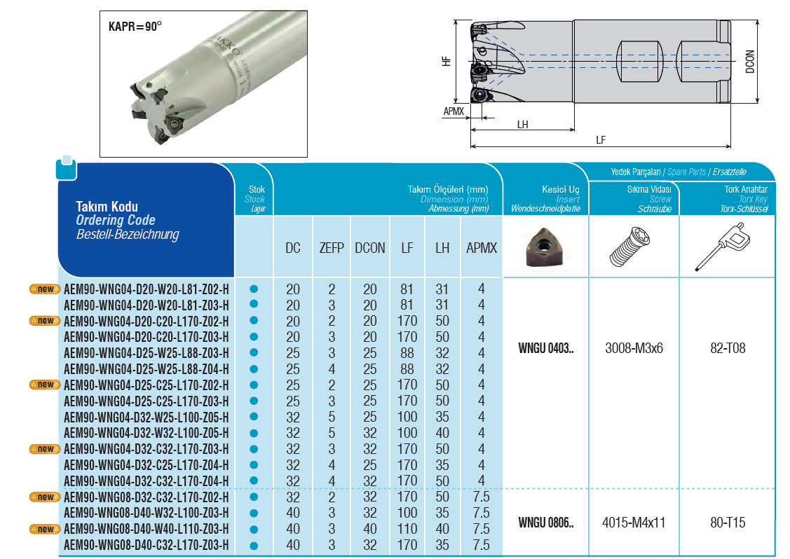 Stopková fréza čelní AEM90-WNG08-D40-C32-L170-Z03-H