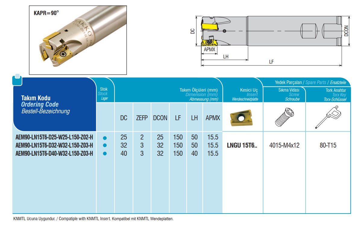 Stopková fréza čelní AKKO MAKINA AEM90-LN15T6-D40-W32-L150-Z03-H
