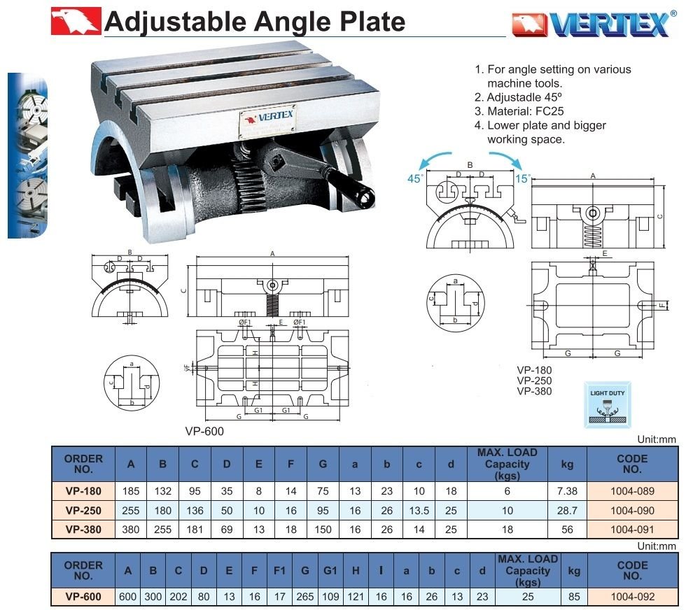 Stůl sklopný VP-180 Rozměr 185 x 132mm Výška 95mm Úhel naklopení -45°/-15° T-drážka stolu 14mm T-drážka pro upnutí 14mm Váha 7,5kg Max zatížení 6kg Materiál FC25