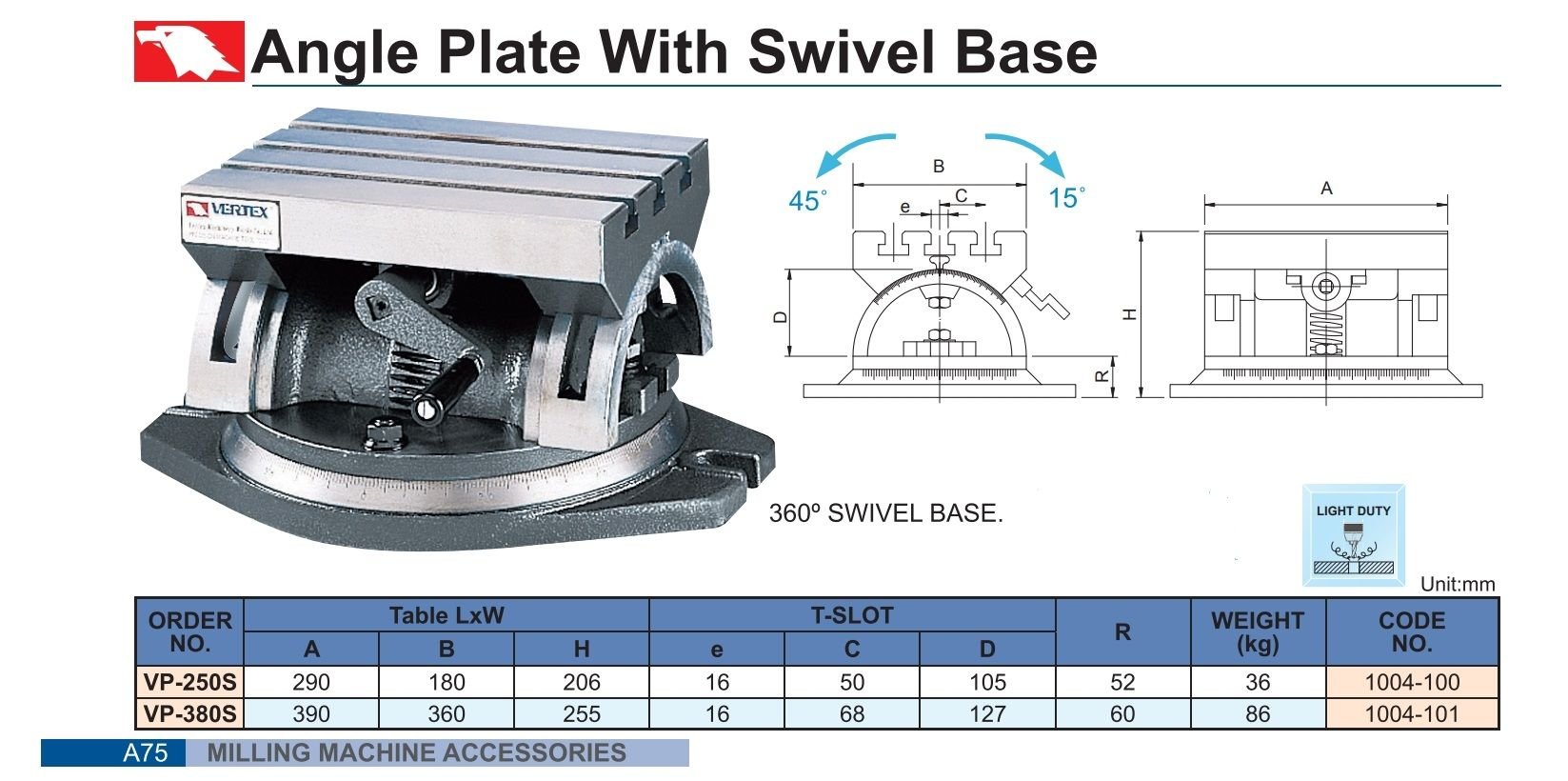 Stůl sklopný VP-380S s točnicí Rozměr 390 x 360mm Výška vč. točnice 255mm Úhel naklopení -45°/-15° T-drážka stolu 16mm T-drážka pro upnutí 18mm Váha 86kg Max zatížení 20kg Materiál FC25