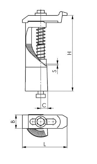 Stupňový upínač ze speciální litiny. Díky kompaktnímu provedení vyžaduje šroubový upínač jen málo místa na stole. Spirálové ozubení umožňuje rychlé přizpůsobení jakékoli výšce obrobku až do cca 320 mm.