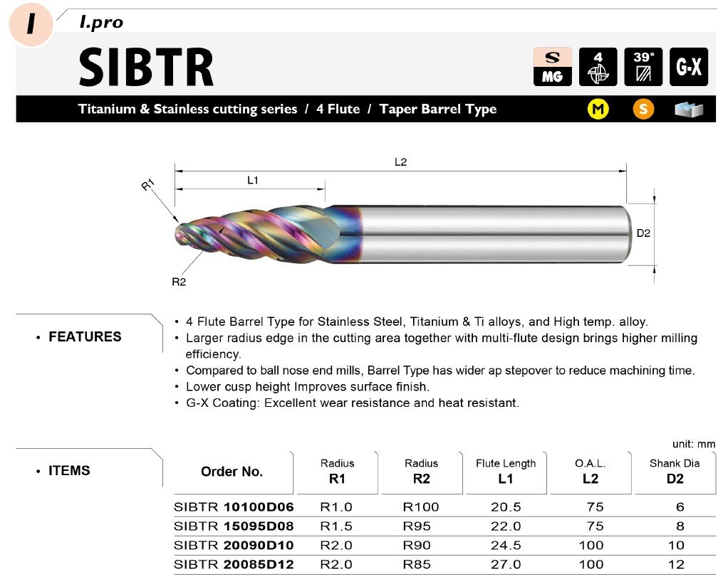 Čtyřbřitá barelová fréza pro nerezovou ocel, slitiny titanu a slitiny pro vysoké teploty. Větší poloměr v řezné oblasti spolu s vícebřitým designem zajišťuje vyšší efektivitu frézování. Nižší výška hřebínků zlepšuje kvalitu povrchu. Technologie povlakování G-X se vyznačuje tepelnou odolností a to do 1000 °C a odolností proti tření.