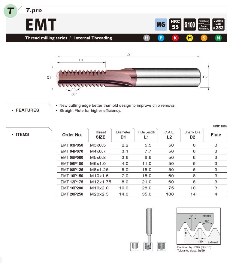 Fréza EMT představuje špičkové řešení pro frézování metrických závitů se stoupáním 0,5–2,5 mm. Díky novému designu s vylepšeným řezným ostřím umožňuje efektivnější odvod třísek a vyšší stabilitu během obrábění. Rovné drážky (Straight Flute) zajišťují vyšší účinnost a přesnost při práci.