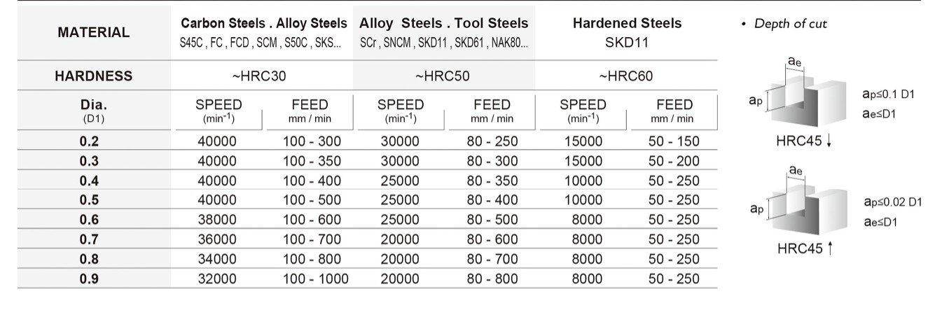 Dvoubřitá čelní fréza micro pro obrábění kalených ocelí do 65 HRC. Pro průměry 0,2–1,8 mm, vhodné pro přesné frézování v běžných aplikacích.