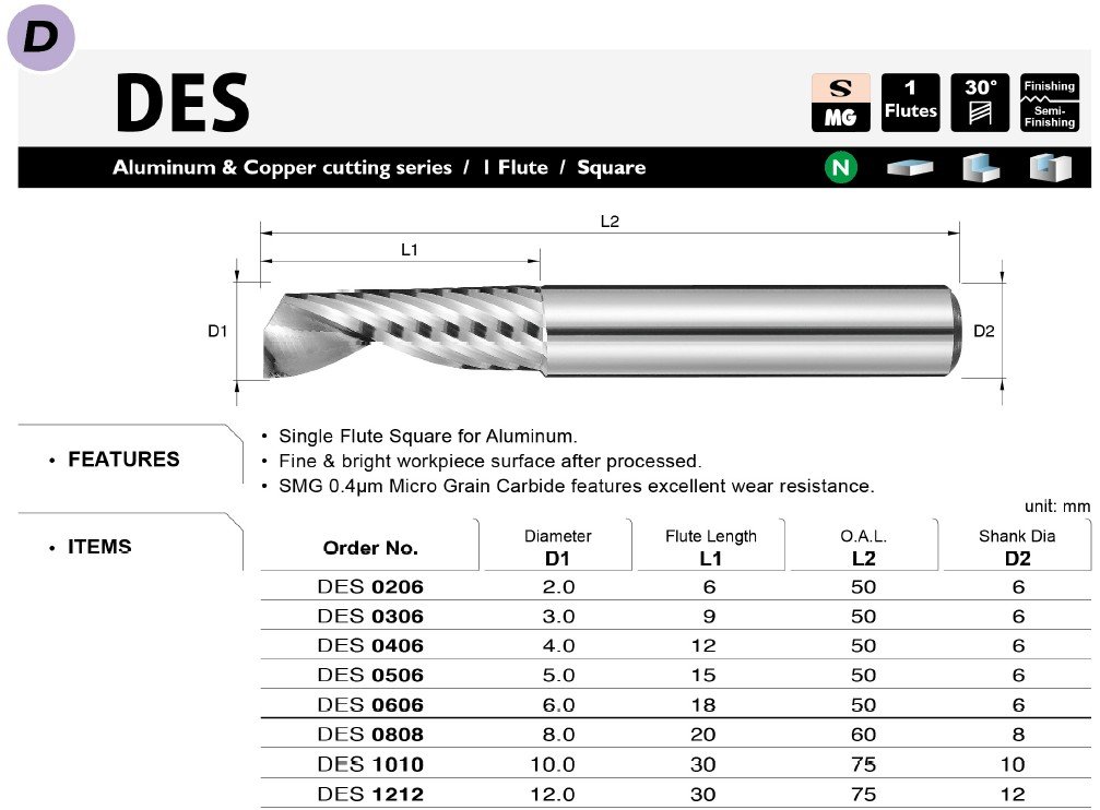 Čelní jednozubá fréza určená pro obrábění hliníkových slitin, duralu a dalších materiálů na bázi hliníku. S jemným a lesklým povrchem obrobku po obrábění.