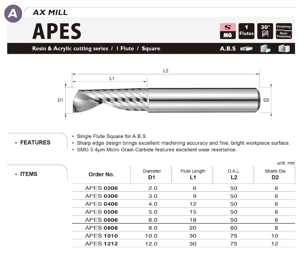 Vysoce přesná jednobřitá fréza určená pro obrábění ABS (Acrylonitrile Butadiene Styrene), akrylu, pryskyřic a dalších technických plastů. ABS je termoplastický polymer známý svou pevností, odolností proti nárazům a snadnou zpracovatelností, často používaný pro výrobu plastových dílů, hraček nebo obalů.