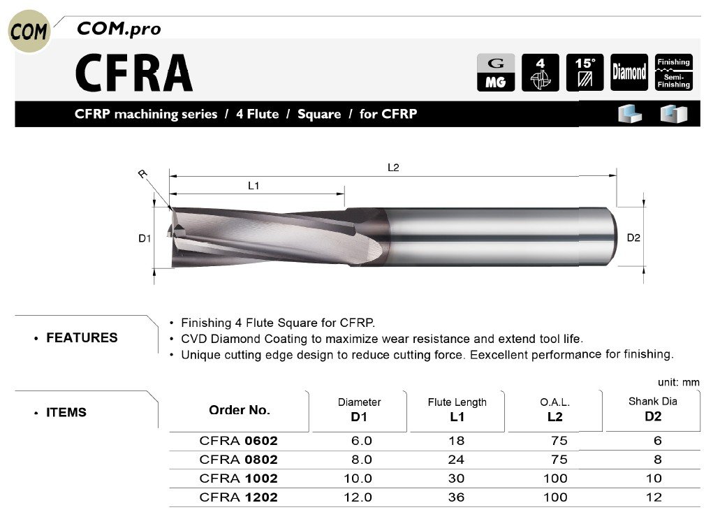 Vysoce výkonná fréza určená pro obrábění CFRP (uhlíkovými vlákny vyztužený polymer). Díky CVD diamantovému povlaku nabízí maximální odolnost proti opotřebení a výrazně prodlužuje životnost nástroje i při náročných provozních podmínkách.