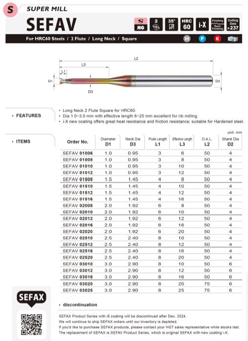 Dlouhá 2břitá kulová fréza pro HRC60. Poloměr R 1,0–R3,0 mm s efektivní délkou 6–25 mm. Vynikající pro frézování žeber.
