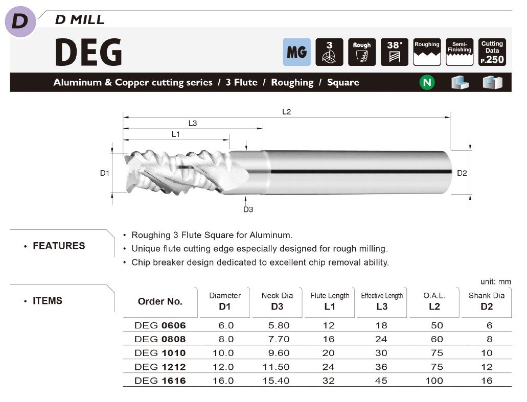 Frézy typu DEG jsou vyrobeny ze substrátu s jemnou velikostí zrna 0,6 µm, což přispívá k vyšší odolnosti a dlouhé životnosti nástroje.