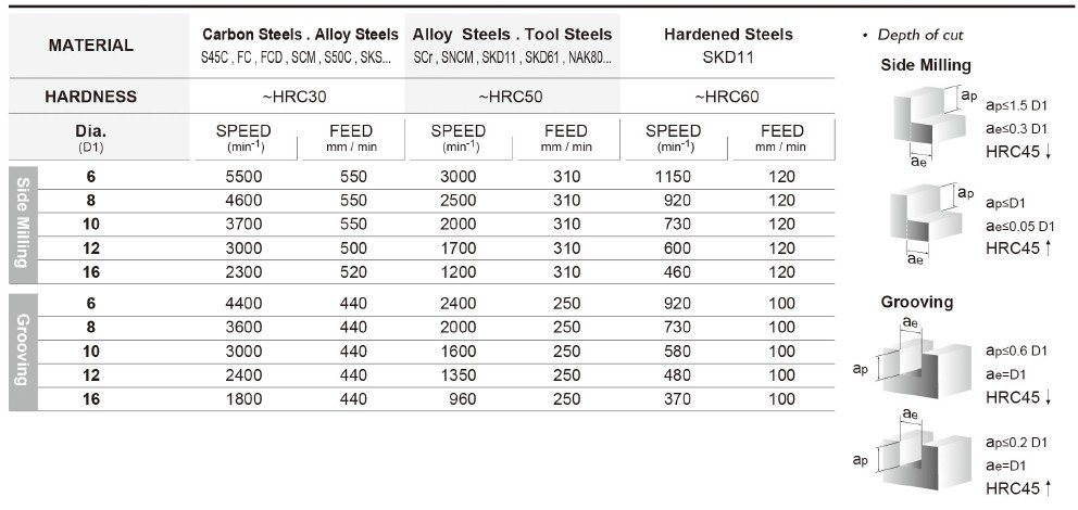 Základem je také kvalitní materiál se speciálním výbrusem pro obrábění materiálů do tvrdosti 55HRC. Vzhledem k náročnosti obrábění a tvrdosti obráběného materiálu je pro frézy EG používán substrát o velikosti zrna 0,6µm s extrémně vysokou odolností vůči lomu a současně vynikající odolností vůči opotřebení.