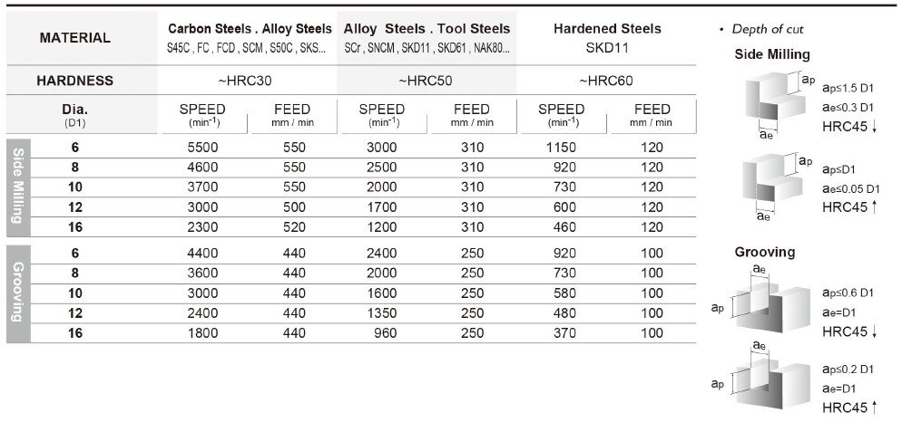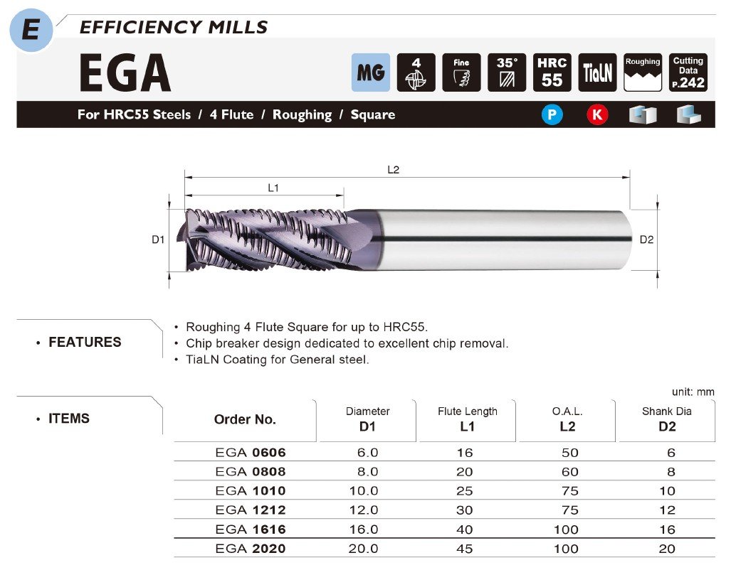 Základem je také kvalitní materiál se speciálním výbrusem pro obrábění materiálů do tvrdosti 55HRC. Vzhledem k náročnosti obrábění a tvrdosti obráběného materiálu je pro frézy EGA používán substrát o velikosti zrna 0,6µm s extrémně vysokou odolností vůči lomu a současně vynikající odolností vůči opotřebení.