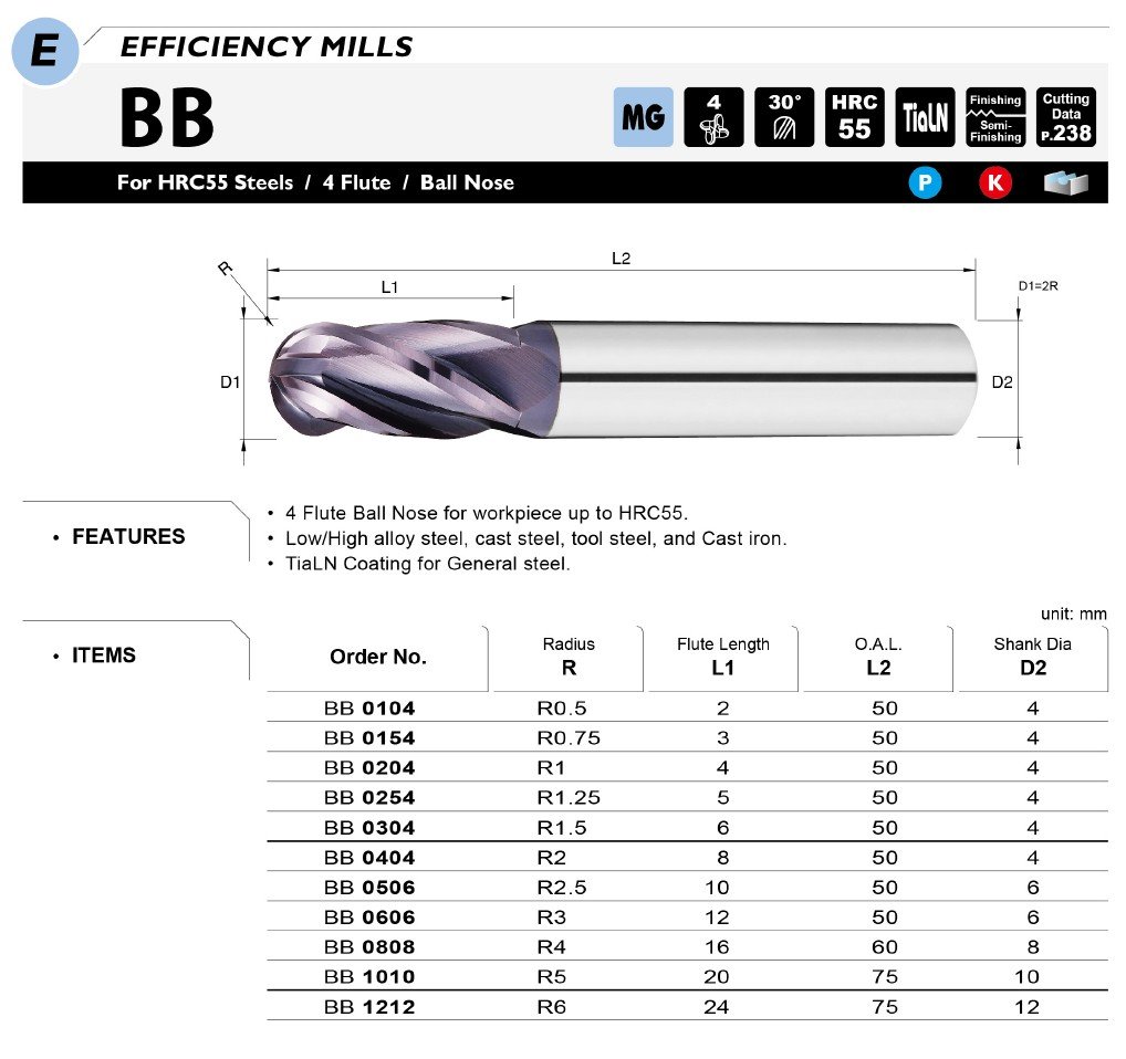 Základem je také kvalitní materiál se speciálním výbrusem pro obrábění materiálů do tvrdosti 55HRC. Vzhledem k náročnosti obrábění a tvrdosti obráběného materiálu je pro frézy BB používán substrát o velikosti zrna 0,6µm s extrémně vysokou odolností vůči lomu a současně vynikající odolností vůči opotřebení.
