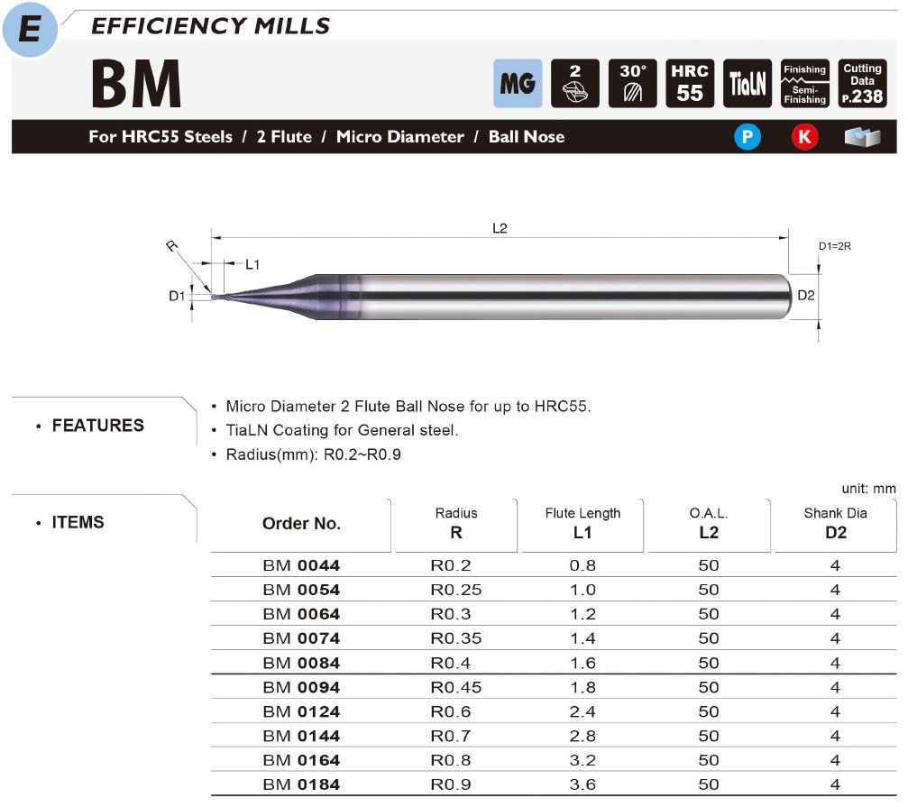 Kulová mikro fréza s poloměrem R0,2–R0,9mm. Technologie povlakování TiaLN se vyznačuje tepelnou odolností a to do 800 °C a odolností proti tření. Díky povlaku TiaLN je nástroj ideální pro nízko a vysokolegovanou ocel, litou ocel, nástrojovou ocel a litinu.