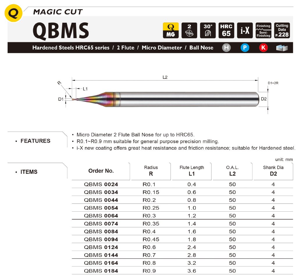 Základem je také kvalitní materiál se speciálním výbrusem pro obrábění materiálů do tvrdosti 65HRC. Vzhledem k náročnosti obrábění a tvrdosti obráběného materiálu je pro frézy QBMS používán nejjemnější substrát o velikosti zrna 0,2µm s extrémně vysokou odolností vůči lomu a současně vynikající odolností vůči opotřebení.