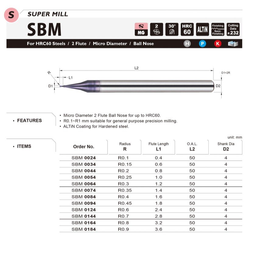 TK stopková fréza kopírovací MICRO SBM0124, 0,12x2,4mm, R0,6