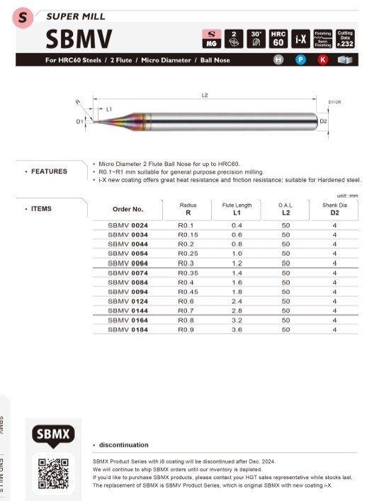 Tato mikroprůměrová dvoubřitá kulová fréza je určena pro obrábění materiálů s tvrdostí až do HRC60. Nabízí rozmezí rádiusů od R0,1 do R1 mm, což ji činí vhodnou pro přesné obrábění při běžném použití.