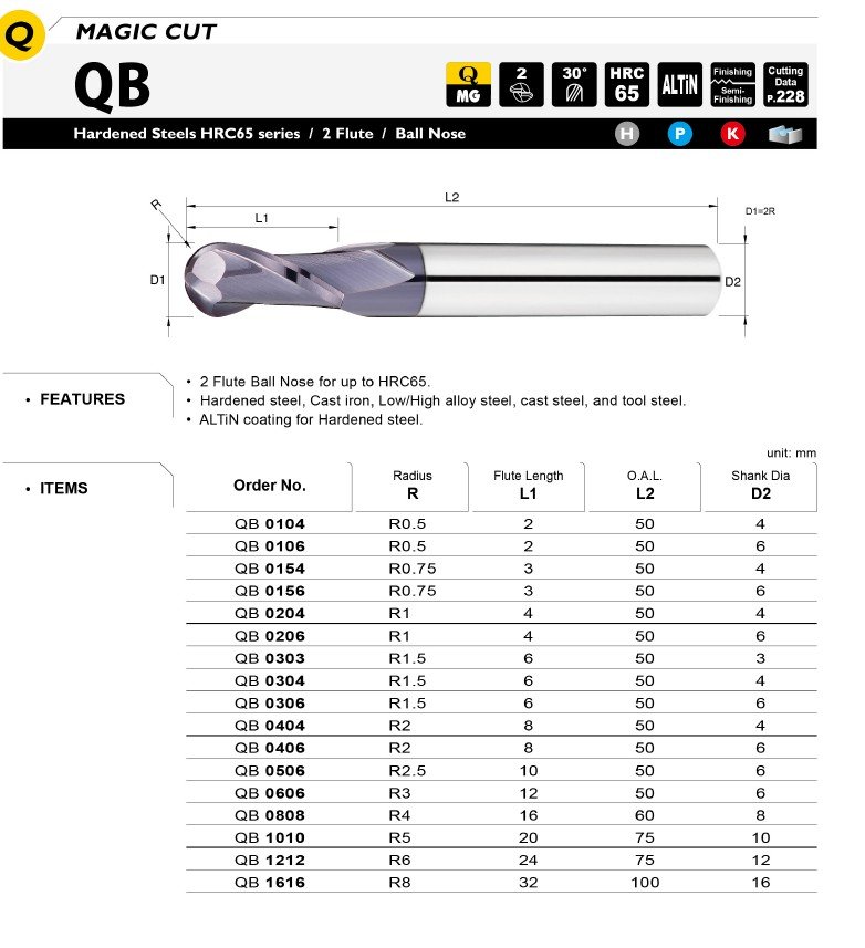 Základem je také kvalitní materiál se speciálním výbrusem pro obrábění materiálů do tvrdosti 65HRC. Vzhledem k náročnosti obrábění a tvrdosti obráběného materiálu je pro frézy QB používán nejjemnější substrát o velikosti zrna 0,2µm s extrémně vysokou odolností vůči lomu a současně vynikající odolností vůči opotřebení.