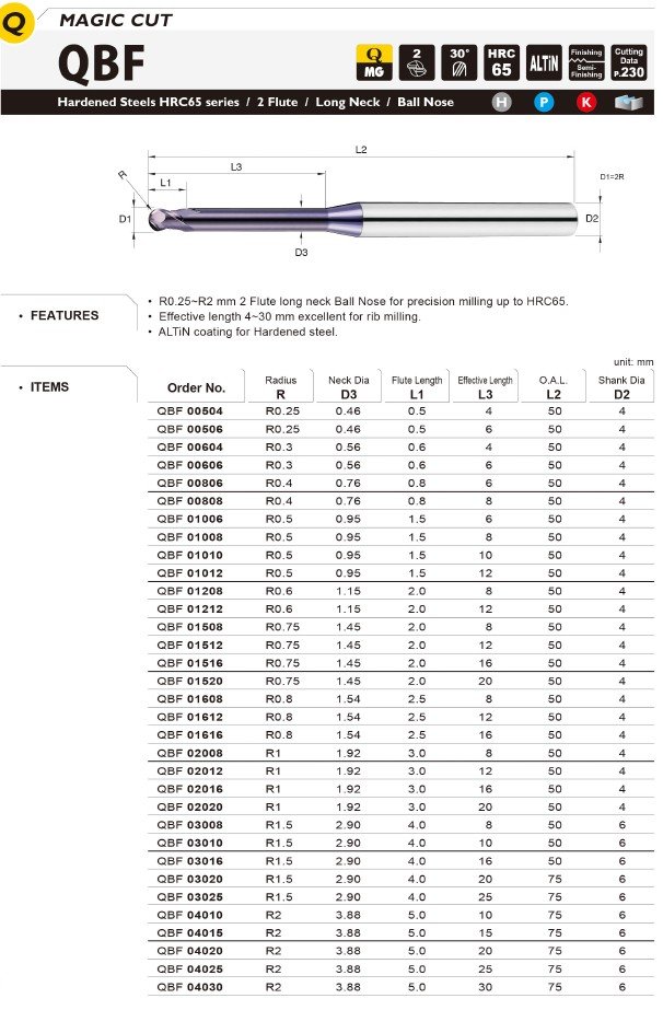 Základem je také kvalitní materiál se speciálním výbrusem pro obrábění materiálů do tvrdosti 65HRC. Vzhledem k náročnosti obrábění a tvrdosti obráběného materiálu je pro frézy používán nejjemnější substrát o velikosti zrna 0,2µm s extrémně vysokou odolností vůči lomu a současně vynikající odolností vůči opotřebení.