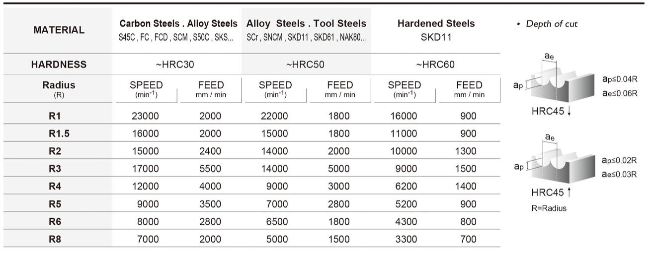 Základem je také kvalitní materiál se speciálním výbrusem pro obrábění materiálů do tvrdosti 65HRC. Vzhledem k náročnosti obrábění a tvrdosti obráběného materiálu je pro frézy používán nejjemnější substrát o velikosti zrna 0,2µm s extrémně vysokou odolností vůči lomu a současně vynikající odolností vůči opotřebení.