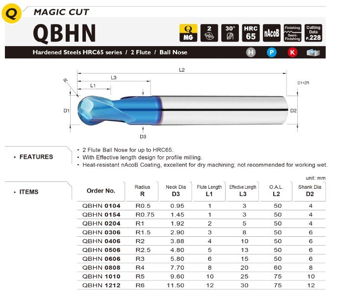 Základem je také kvalitní materiál se speciálním výbrusem pro obrábění materiálů do tvrdosti 65HRC. Vzhledem k náročnosti obrábění a tvrdosti obráběného materiálu je pro frézy QBHN používán nejjemnější substrát o velikosti zrna 0,2µm s extrémně vysokou odolností vůči lomu a současně vynikající odolností vůči opotřebení.