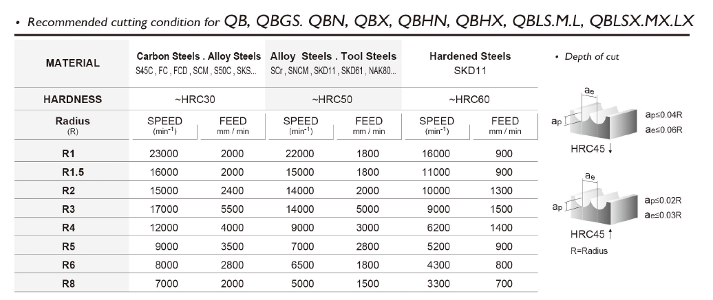Základem je také kvalitní materiál se speciálním výbrusem pro obrábění materiálů do tvrdosti 65HRC. Vzhledem k náročnosti obrábění a tvrdosti obráběného materiálu je pro frézy QBN používán nejjemnější substrát o velikosti zrna 0,2µm s extrémně vysokou odolností vůči lomu a současně vynikající odolností vůči opotřebení.