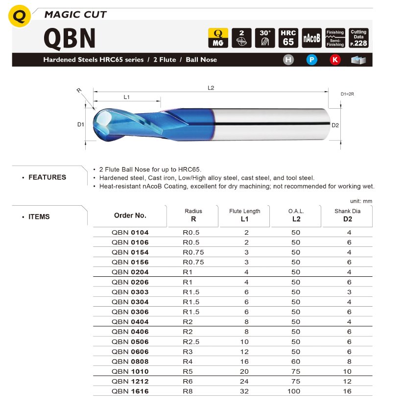 Základem je také kvalitní materiál se speciálním výbrusem pro obrábění materiálů do tvrdosti 65HRC. Vzhledem k náročnosti obrábění a tvrdosti obráběného materiálu je pro frézy QBN používán nejjemnější substrát o velikosti zrna 0,2µm s extrémně vysokou odolností vůči lomu a současně vynikající odolností vůči opotřebení.