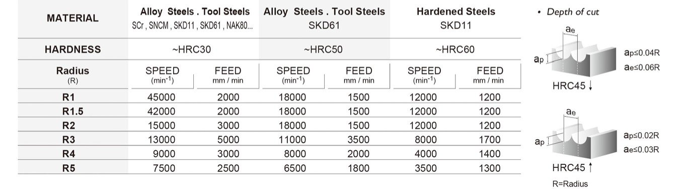 Základem je také kvalitní materiál se speciálním výbrusem pro obrábění materiálů do tvrdosti 65HRC. Vzhledem k náročnosti obrábění a tvrdosti obráběného materiálu je pro frézy používán nejjemnější substrát o velikosti zrna 0,2µm s extrémně vysokou odolností vůči lomu a současně vynikající odolností vůči opotřebení.