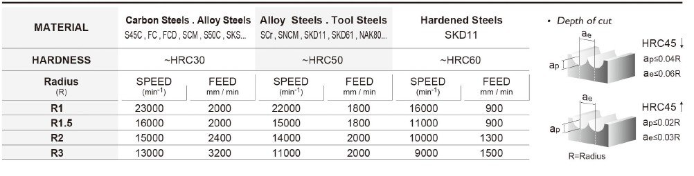 Základem je také kvalitní materiál se speciálním výbrusem pro obrábění materiálů do tvrdosti 60HRC. Vzhledem k náročnosti obrábění a tvrdosti obráběného materiálu je pro frézy používán substrát o velikosti zrna 0,5µm s vysokou odolností vůči lomu a současně vynikající odolností vůči opotřebení.