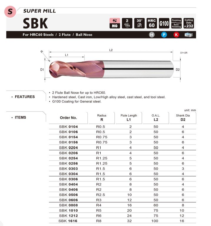 Kopírovací dvoubřitá fréza pro obrábění materiálů s tvrdostí až do HRC 60. Je vhodný pro kalenou ocel, litinu, nízko- i vysokolegovanou ocel, lité oceli a nástrojovou ocel. Technologie povlakování G100 se vyznačuje tepelnou odolností a to do 800 °C.