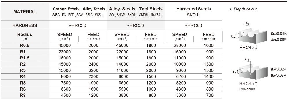 Základem je také kvalitní materiál se speciálním výbrusem pro obrábění materiálů do tvrdosti 60HRC. Vzhledem k náročnosti obrábění a tvrdosti obráběného materiálu je pro frézy používán substrát o velikosti zrna 0,5µm s vysokou odolností vůči lomu a současně vynikající odolností vůči opotřebení.