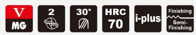 Základem je také kvalitní materiál se speciálním výbrusem pro obrábění materiálů do tvrdosti 70HRC. Vzhledem k náročnosti obrábění a tvrdosti obráběného materiálu je pro frézy V70 používán nejjemnější substrát o velikosti zrna 0,2µm s extrémně vysokou odolností vůči lomu a současně vynikající odolností vůči opotřebení.