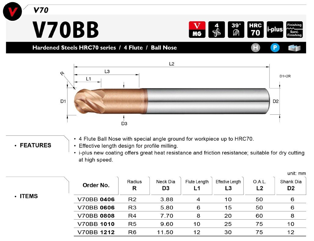 Základem je také kvalitní materiál se speciálním výbrusem pro obrábění materiálů do tvrdosti 70HRC. Vzhledem k náročnosti obrábění a tvrdosti obráběného materiálu je pro frézy V70 používán nejjemnější substrát o velikosti zrna 0,2µm s extrémně vysokou odolností vůči lomu a současně vynikající odolností vůči opotřebení.