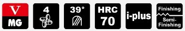 Základem je také kvalitní materiál se speciálním výbrusem pro obrábění materiálů do tvrdosti 70HRC. Vzhledem k náročnosti obrábění a tvrdosti obráběného materiálu je pro frézy V70 používán nejjemnější substrát o velikosti zrna 0,2µm s extrémně vysokou odolností vůči lomu a současně vynikající odolností vůči opotřebení.