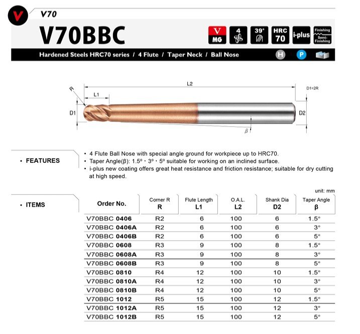 Základem je také kvalitní materiál se speciálním výbrusem pro obrábění materiálů do tvrdosti 70HRC. Vzhledem k náročnosti obrábění a tvrdosti obráběného materiálu je pro frézy V70 používán nejjemnější substrát o velikosti zrna 0,2µm s extrémně vysokou odolností vůči lomu a současně vynikající odolností vůči opotřebení.