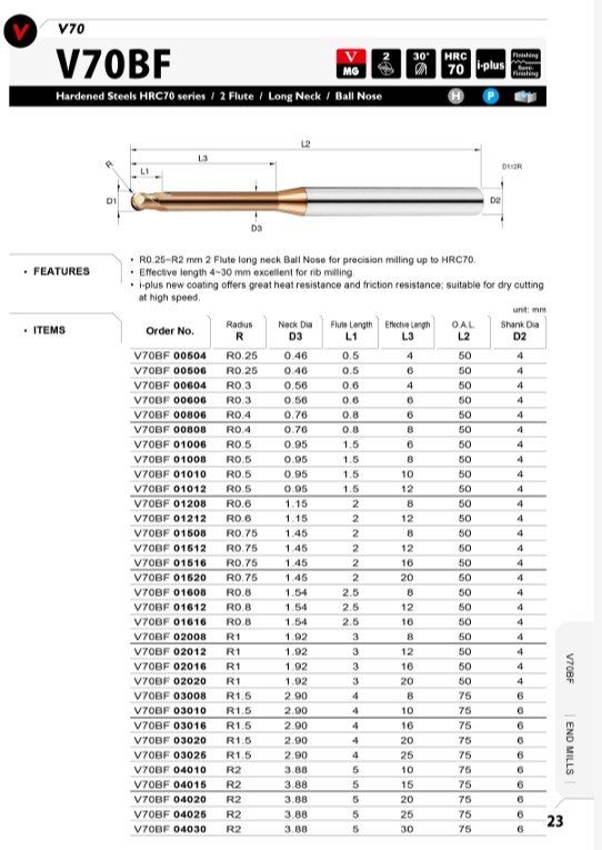 Základem je také kvalitní materiál se speciálním výbrusem pro obrábění materiálů do tvrdosti 70HRC. Vzhledem k náročnosti obrábění a tvrdosti obráběného materiálu je pro frézy V70 používán nejjemnější substrát o velikosti zrna 0,2µm s extrémně vysokou odolností vůči lomu a současně vynikající odolností vůči opotřebení.