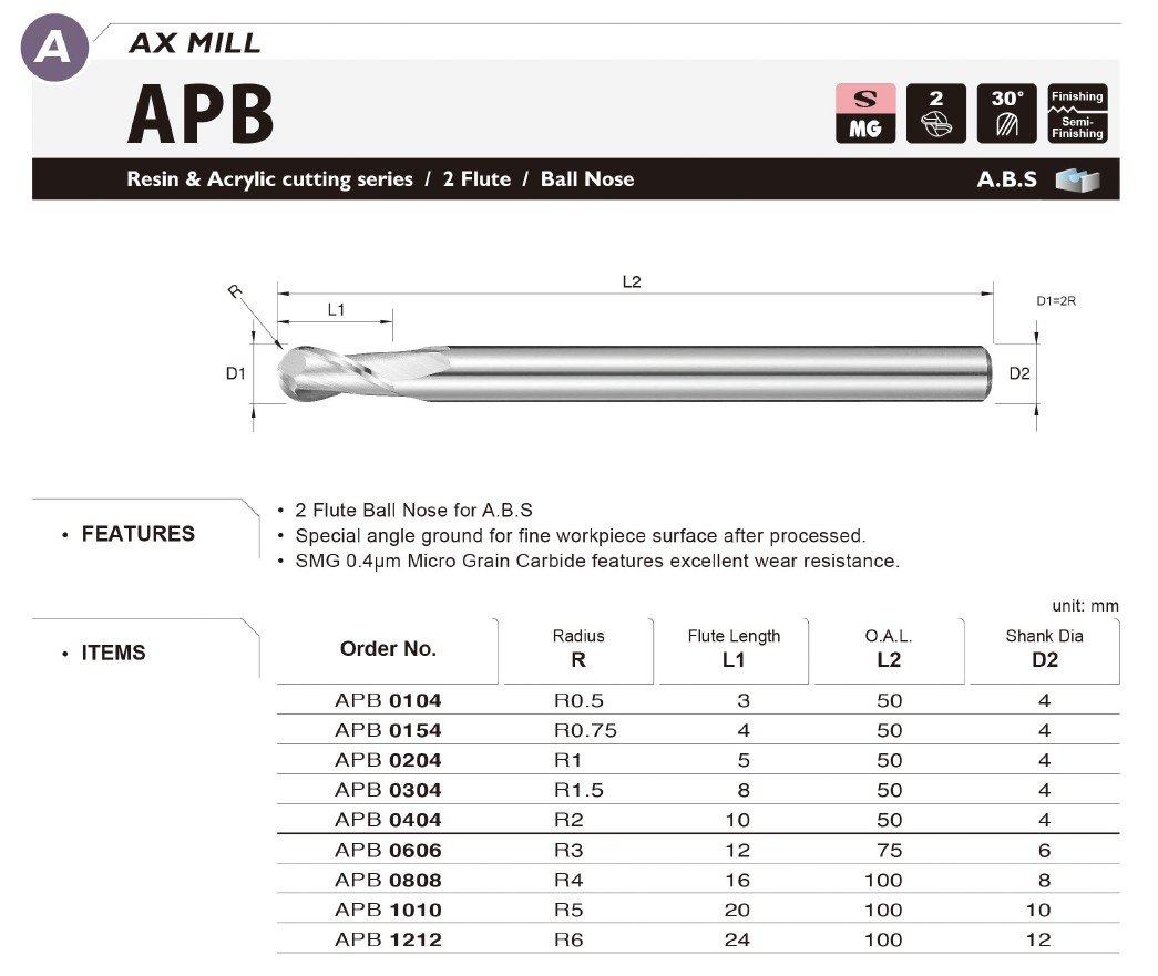Vysoce přesná 2-břitá fréza určená pro obrábění ABS (Acrylonitrile Butadiene Styrene), akrylu, pryskyřic a dalších technických plastů. ABS je termoplastický polymer známý svou pevností, odolností proti nárazům a snadnou zpracovatelností, často používaný pro výrobu plastových dílů, hraček nebo obalů.
