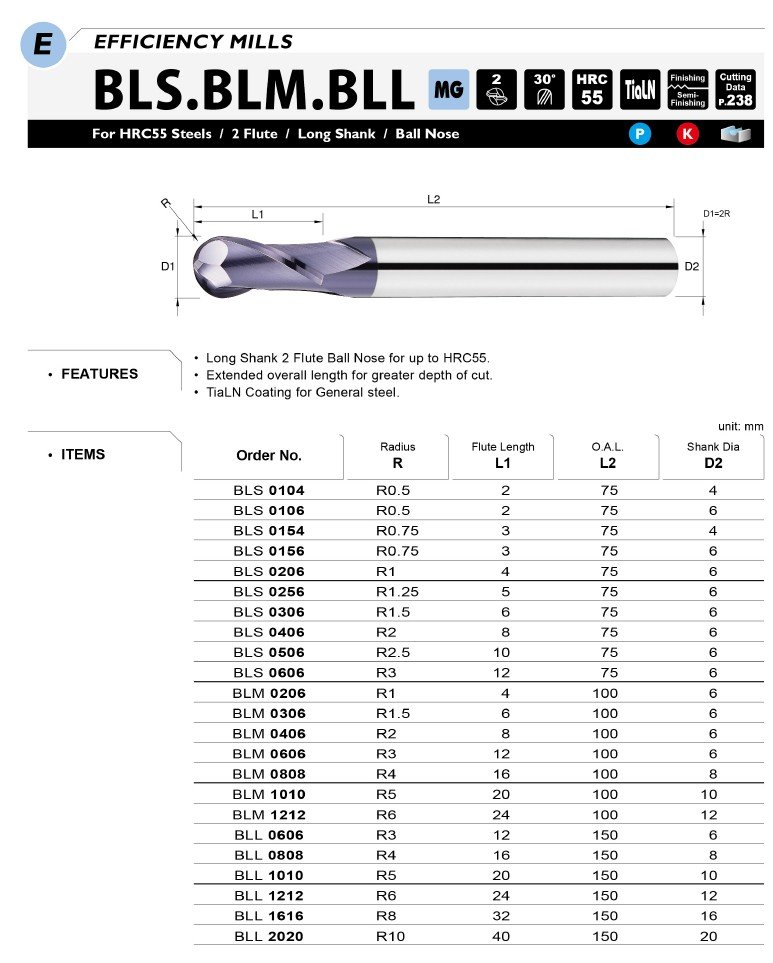Základem je také kvalitní materiál se speciálním výbrusem pro obrábění materiálů do tvrdosti 55HRC. Vzhledem k náročnosti obrábění a tvrdosti obráběného materiálu je pro frézy BLM používán substrát o velikosti zrna 0,6µm s extrémně vysokou odolností vůči lomu a současně vynikající odolností vůči opotřebení.