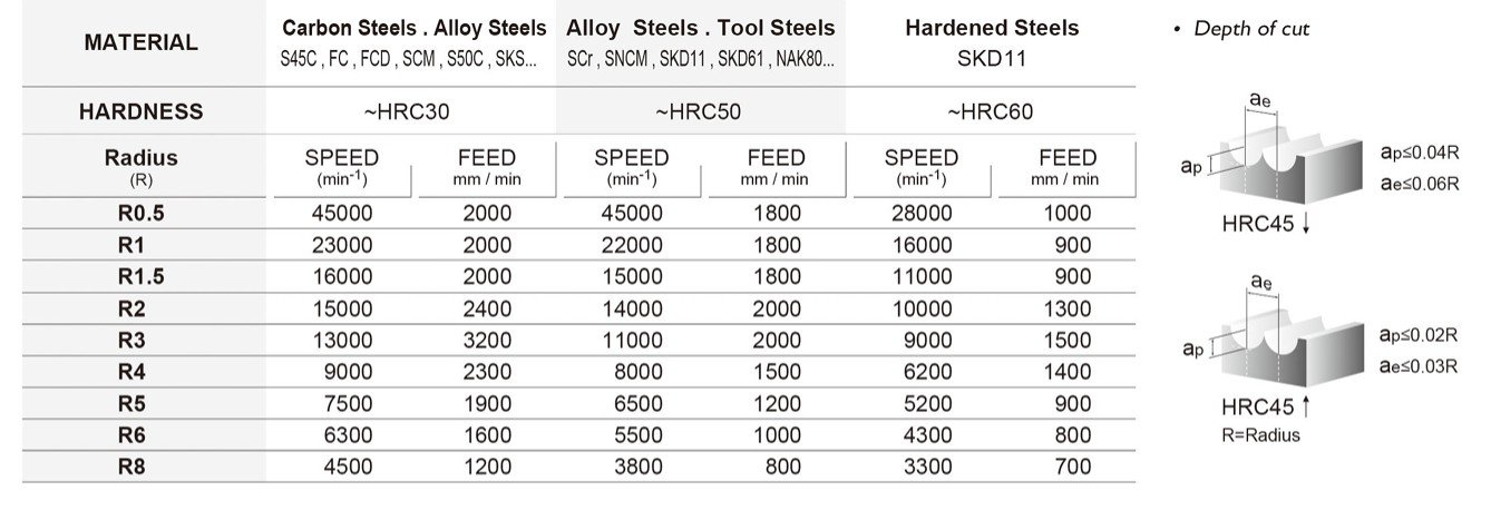 Základem je také kvalitní materiál se speciálním výbrusem pro obrábění materiálů do tvrdosti 60HRC. Vzhledem k náročnosti obrábění a tvrdosti obráběného materiálu je pro frézy používán substrát o velikosti zrna 0,5µm s vysokou odolností vůči lomu a současně vynikající odolností vůči opotřebení.