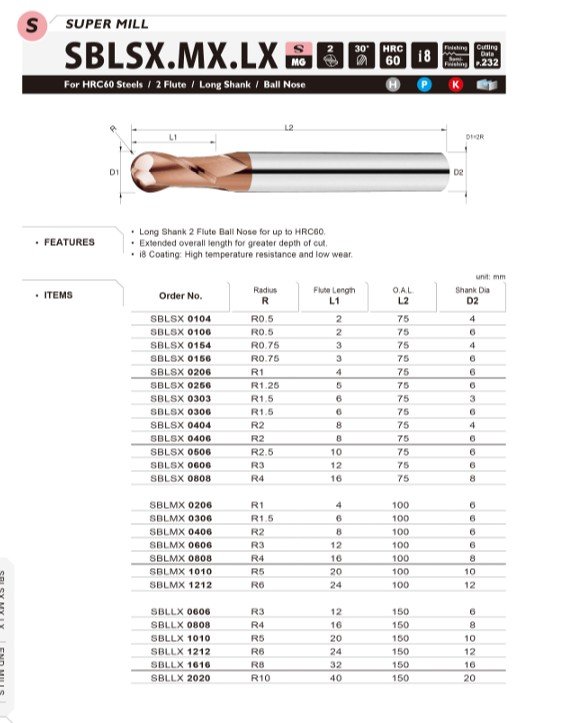 Základem je také kvalitní materiál se speciálním výbrusem pro obrábění materiálů do tvrdosti 60HRC. Vzhledem k náročnosti obrábění a tvrdosti obráběného materiálu je pro frézy používán substrát o velikosti zrna 0,5µm s vysokou odolností vůči lomu a současně vynikající odolností vůči opotřebení.