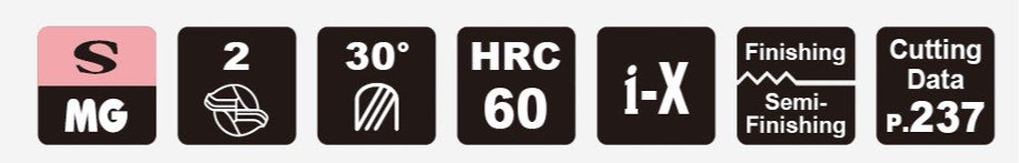 Dlouhá 2břitá kulová fréza pro HRC60. Poloměr R 0,25–R2,0 mm s efektivní délkou 4–30 mm. Vynikající pro frézování žeber.