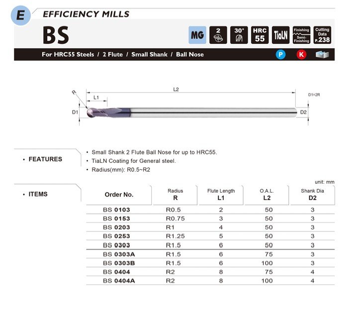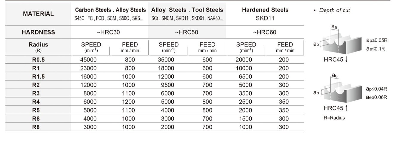 Základem je také kvalitní materiál se speciálním výbrusem pro obrábění materiálů do tvrdosti 55HRC. Vzhledem k náročnosti obrábění a tvrdosti obráběného materiálu je pro frézy používán substrát o velikosti zrna 0,6µm s extrémně vysokou odolností vůči lomu a současně vynikající odolností vůči opotřebení.