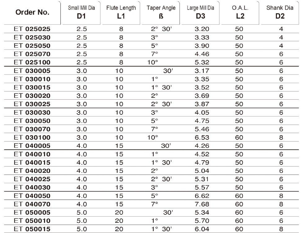 TK stopková fréza kuželová ET050025, 5x20mm,β 2°30\'