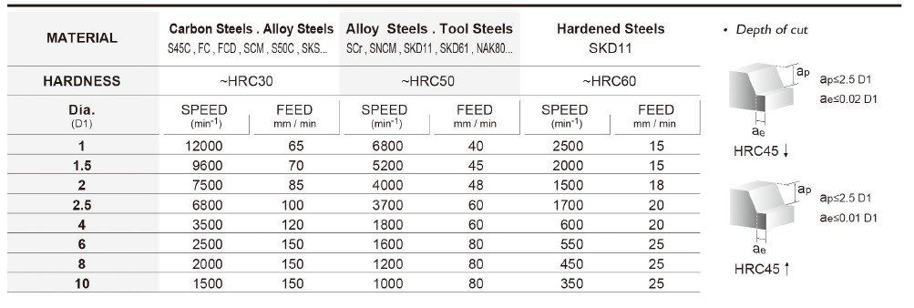 Základem je také kvalitní materiál se speciálním výbrusem pro obrábění materiálů do tvrdosti 55HRC. Vzhledem k náročnosti obrábění a tvrdosti obráběného materiálu je pro frézy používán substrát o velikosti zrna 0,6µm s extrémně vysokou odolností vůči lomu a současně vynikající odolností vůči opotřebení.