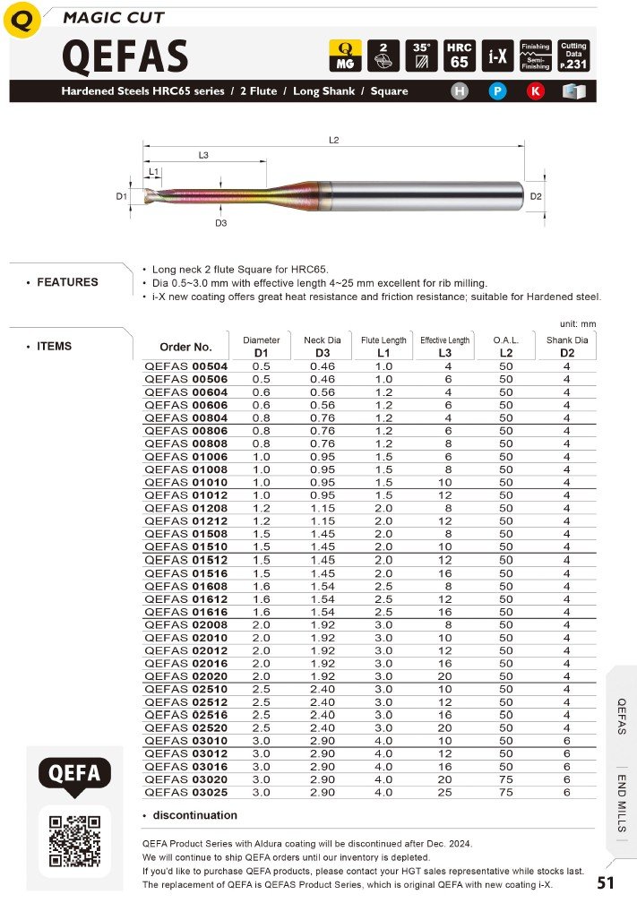 Dvoubřitá čelní fréza s dlouhým krkem ( odlehčením ) je určena pro obrábění kalené oceli až do tvrdosti HRC65. Nabízí průměry v rozsahu 0,5–3,0 mm a efektivní délku řezu 4–25 mm.