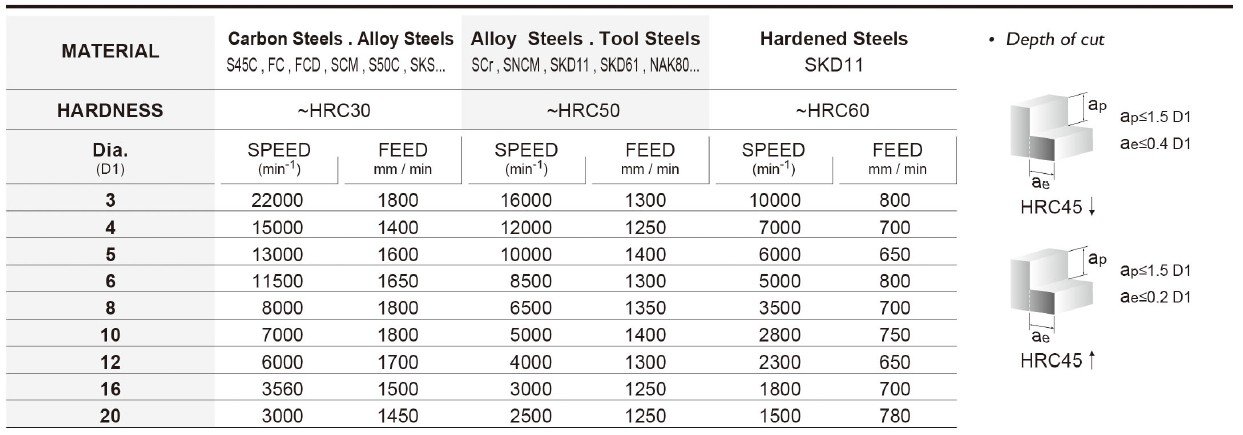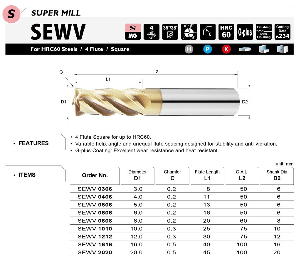 Základem je také kvalitní materiál se speciálním výbrusem pro obrábění materiálů do tvrdosti 60HRC. Vzhledem k náročnosti obrábění a tvrdosti obráběného materiálu je pro frézy SEWV používán substrát o velikosti zrna 0,5µm s vysokou odolností vůči lomu a současně vynikající odolností vůči opotřebení.