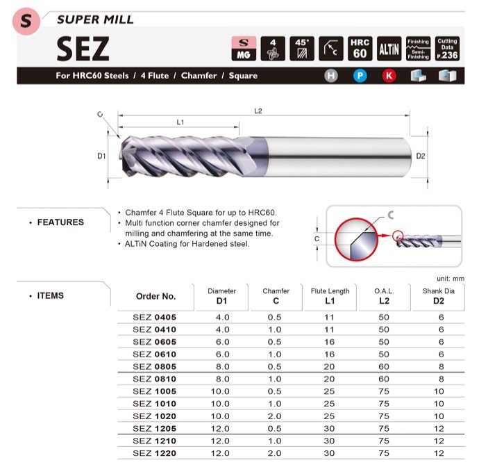 Multifunkční fréza pro frézování a současné srážení hran. Technologie povlakování ALTiN se vyznačuje tepelnou odolností a to do 900 °C. Díky povlaku ALTiN je ideální pro práci s tvrdými materiály, titan, nikl a žáruvzdorné slitiny. Prodloužená délka břitů je vhodná pro hluboké boční frézování.