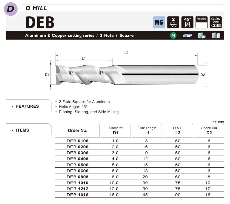 Frézy typu DEB jsou vyrobeny ze substrátu s jemnou velikostí zrna 0,6 µm, což přispívá k vyšší odolnosti a dlouhé životnosti nástroje.
