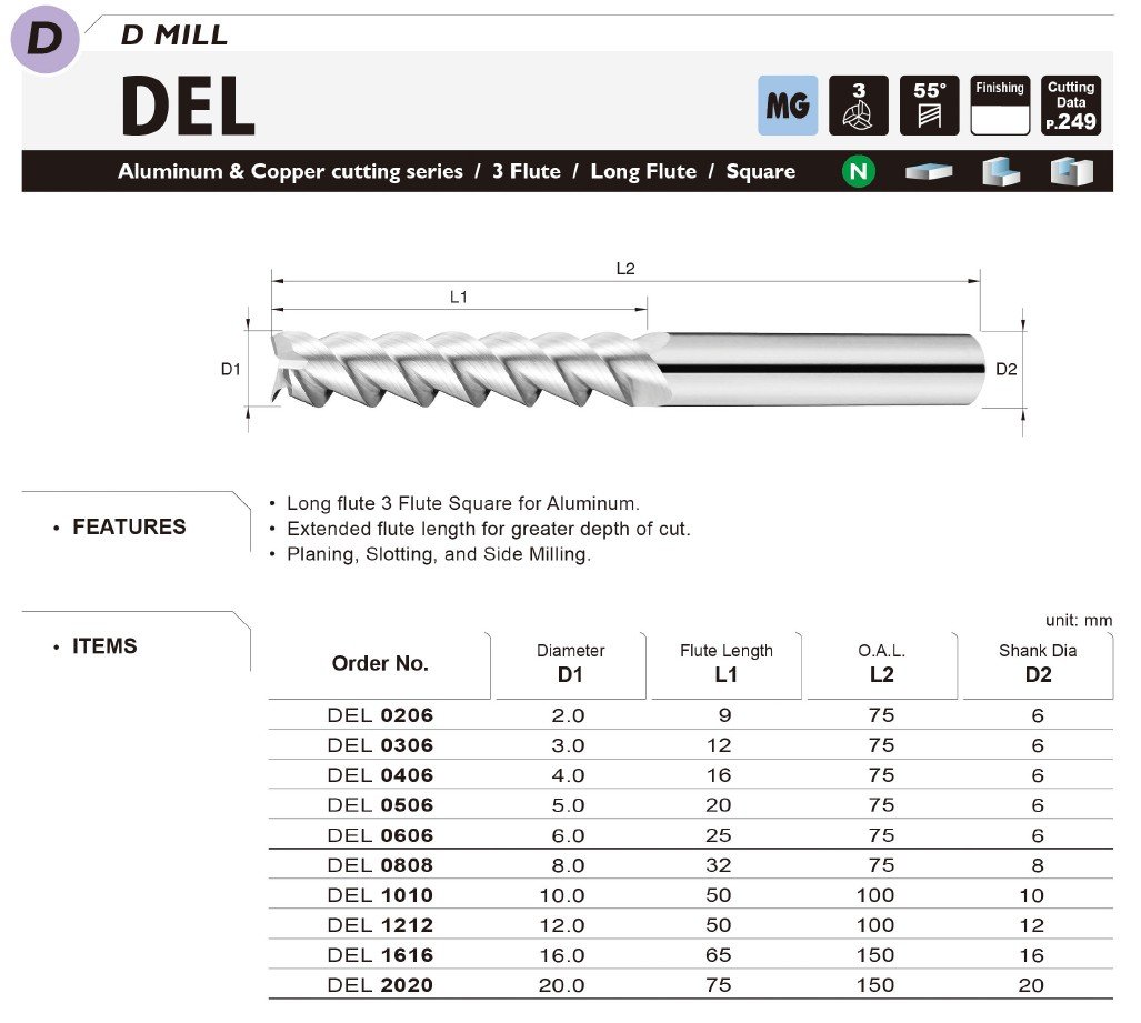 Vysoce výkonná dlouhá čelní fréza určená pro obrábění hliníkových slitin, duralu a dalších materiálů na bázi hliníku. Prodloužená délka břitů pro větší hloubku řezu. Vhodné pro čelní obrábění, drážkování a boční frézování.