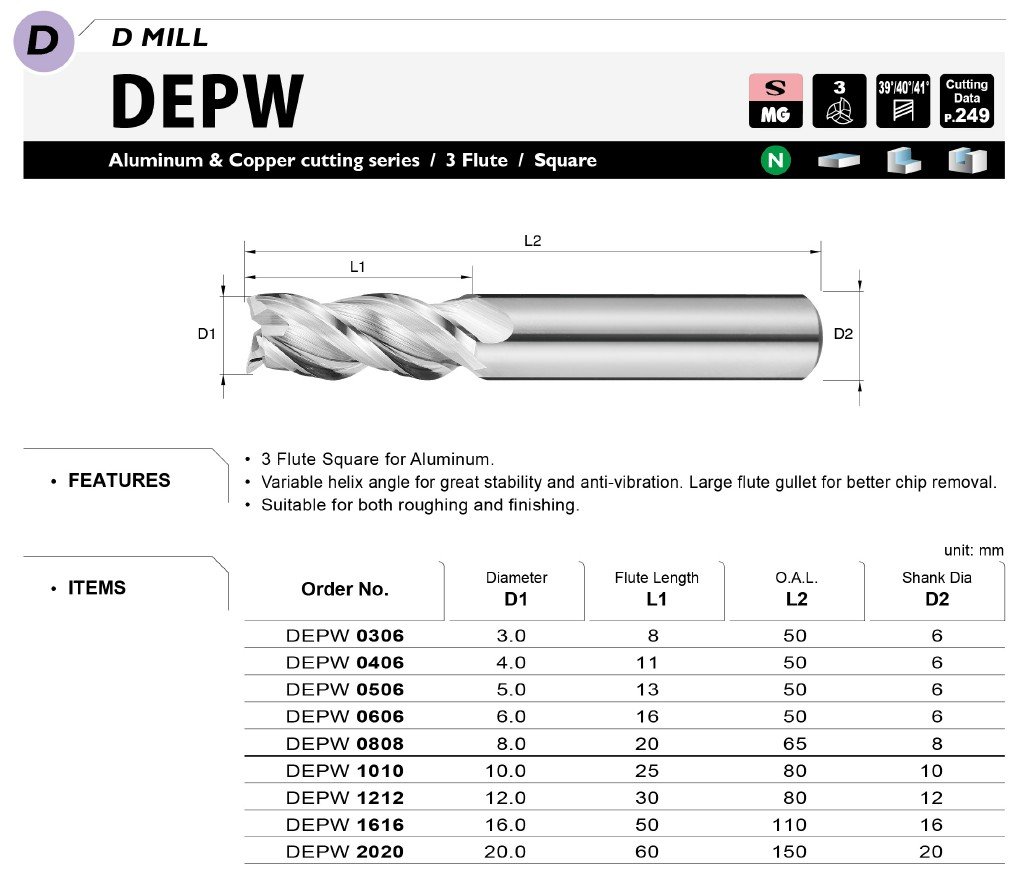 Frézy typu DEPW jsou vyrobeny ze substrátu s jemnou velikostí zrna 0,5 µm, což přispívá k vyšší odolnosti a dlouhé životnosti nástroje.