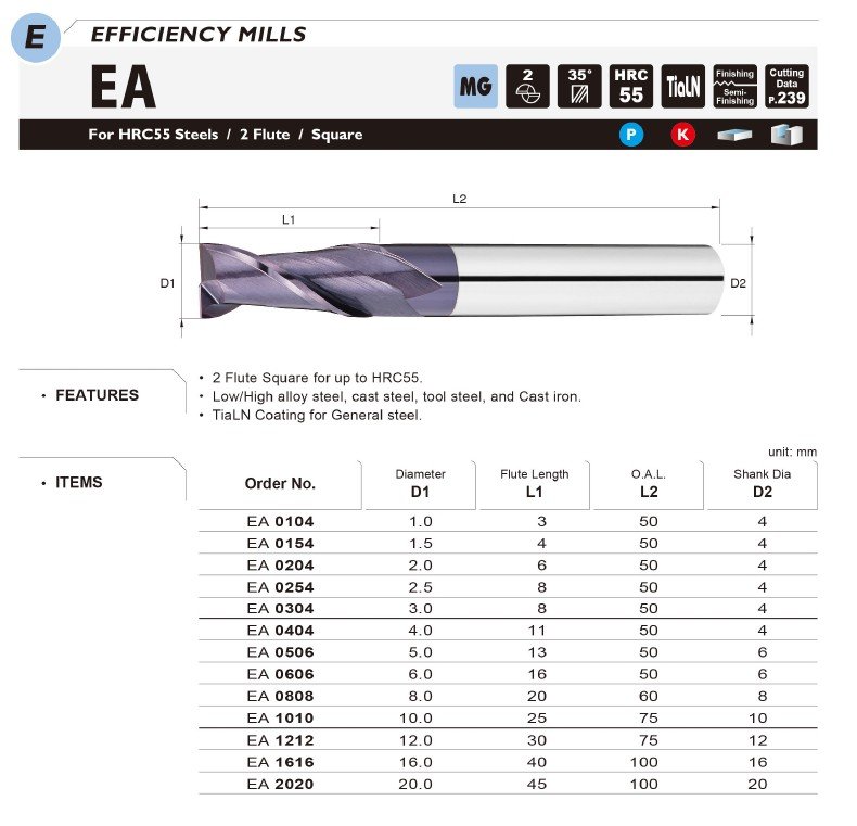 Základem je také kvalitní materiál se speciálním výbrusem pro obrábění materiálů do tvrdosti 55HRC. Vzhledem k náročnosti obrábění a tvrdosti obráběného materiálu je pro frézy EA používán substrát o velikosti zrna 0,6µm s odolností vůči lomu a současně vynikající odolností vůči opotřebení.